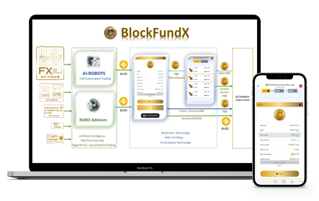 BlockfundX utilizes the existing PBX token ecosystem, Blockchain technology, Web3.0 Dapp, and Cloud-based technology. BlockFundX connects all the investment strategies into Blockchain’s Block, including fully automated trading and Robo-advisors for any asset such as Indexes, Stocks, FX, Crypto, Gold. In addition, BlockFundX pays the reward via Stable coin (USDT) each second.